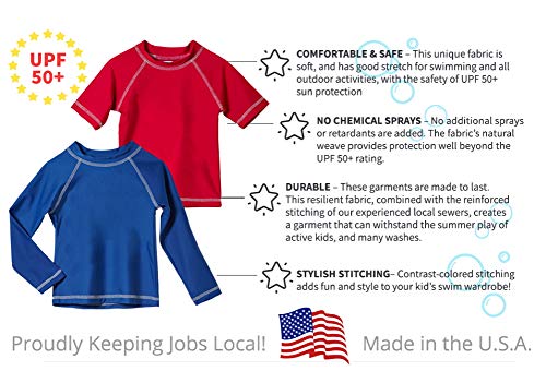 Kids will enjoy this super-comfortable swimming rashguard while parents will love the high-quality fabric, SPF/UPF 50+ protection, and Made in the USA tag. The subtle but cool contrast stitching creates a stylish modern design.