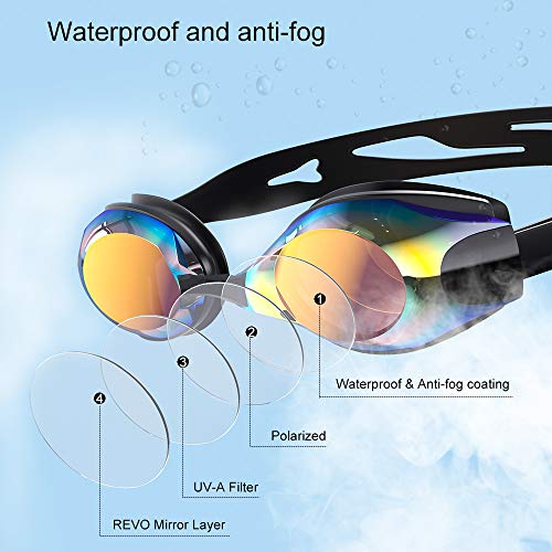 Special Polarized Lens with UV Protection- The colorful outer surface of the lenses with UV-Protection coating enables our swim goggles to reflect harmful UV rays and protect your eyes from heat and damage of the sunrays, providing stylish mirror look and better eyes protection for outdoor swimming, surfing, kayaking, sailing and other water related sports.
