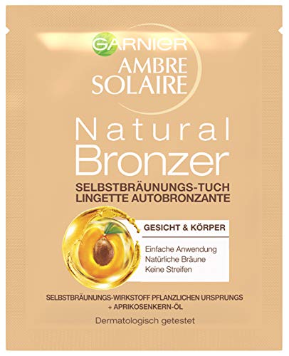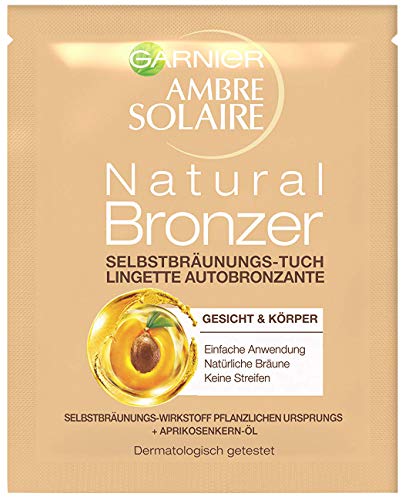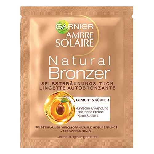 The Garnier Ambre Solaire Natural Bronzer self-tanning cloth gives the skin a natural-looking tan and is easy to use. This makes the practical disposable cloth ideal for a quick tan in between and to refresh the summer complexion on the face and cleavage area – without the risk of sunburn and solarium. Due to its handy size, it fits easily into any handbag or beach bag. The self-tanning cloth is already soaked with the right dose of self-tanning lotion and can be used immediately. Simply rub the cloth over the skin areas and carefully distribute the self-tanner. Once quickly absorbed, the formula enriched with apricot oil provides the skin with moisture for up to 12 hours. The skin gets an even, streak-free tan after about three to four hours, leaving it looking fresh and radiant. A Garnier Ambre Solaire Natural Bronzer self-tanning cloth is enough for a single application on the face and cleavage area. Ideal for when it needs to be fast. And for the fast, golden shimmering summer tan all over the body, there is the Garnier Ambre Solaire Natural Bronzer self-tanning spray. The practical spray bottle can also be used overhead. Simply spray on and leave to soak in – the spray does not have to be distributed on the skin and develops a streak-free, even summer tan.