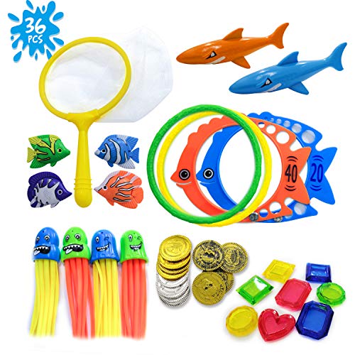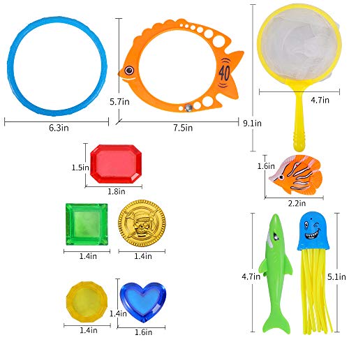 Unique Diving Pool Toys Set – Equipped with Pirate Treasure*8, Golden Coin*4, Silver Coin*4, Copper*4, Jellyfish*4, Tropical Fish*4, Round Diving Ring*2, Fish Pool Ring*2, Shark*2, Dip Net*1 and Net Bag*1, super suitable for 2 or more kids to play the pool game in the yard/swimming pool during the hot summer