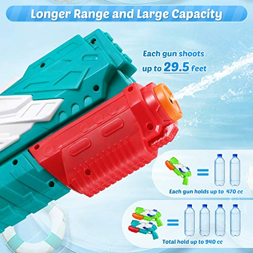 High Capacity & Long Range – Each squirt gun holds about 16 fl oz (470CC) Water and shoots 30 feet or so. 2 pack allows kids to have water gun fights with their friends.