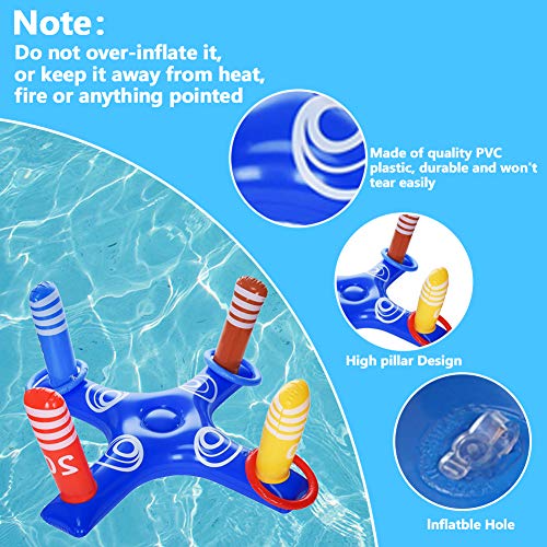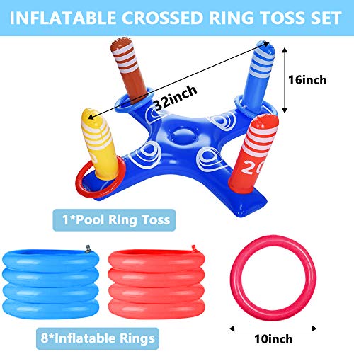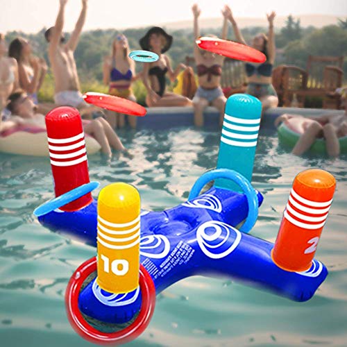 🌊 POOL PARTY GAME:1Pcs *Cross Ring Toss 8 Pcs *Rings. The inflatable rings have two colors, which are 4 blue, 4 red. This water game toy set is the perfect gift for children and adults. It will be popular with kids in party or pool party to provide 2-3 people to play, and its enough quantities could make kids play the match and active atmosphere. Tips: If it’s a party, we recommend buying multiple to let your friends and children interact.