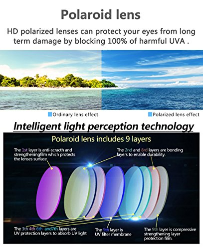 POLARIZED LENS – HD polarized lenses can filter out sunlight reflected glare and protect your eyes from long term damage by blocking 100% of harmful UVA and UVB rays. Restore true color, eliminate reflected light and scattered light and protect eyes perfectly. Polarized sunglasses cut glare and haze so your eyes are more comfortable and you can see better.