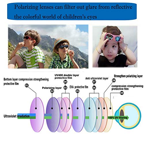 [Perfect Lens Effective UV Protection]: Kids Polarized Sunglasses maximize eye protection against harmful UVA / UVB rays. UVA and UVB UV-blocking lenses increase polarization and eliminate glare while maintaining color integrity. The 7-layer triacetate TAC lens adds durability and impact resistance to ANSI standards. 2 types of medium-tone lenses, the light transmittance is 20%, reducing the damage of strong light to children’s eyes, and protecting children’s eyes!