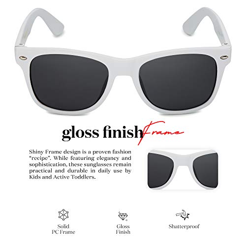 ✅ ADD STYLE TO YOUR KID’S OUTFIT: The glossy, colorful frames and smoke lenses of our kids’ sunglasses complement your toddler’s formal or casual outfit – on a special event or in the playground!