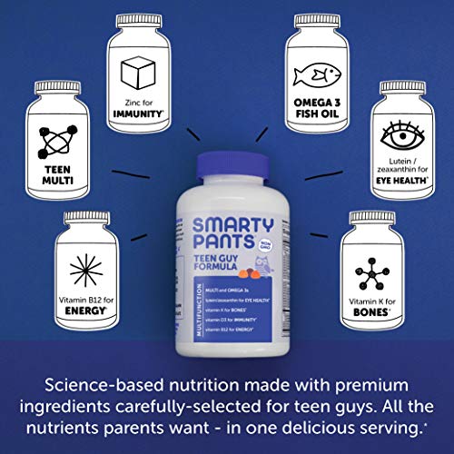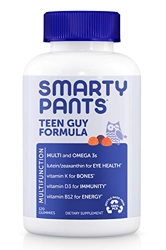 SmartyPants Teen Guy Complete is a multifunctional supplement that delivers omega-3s from fish oil, lutein and zeaxanthin for eye health, and essential nutrients including vitamin D3 for bones, zinc for healthy hair, skin, and nails, and vitamin B12 for immune support –all in one delicious gummy.*