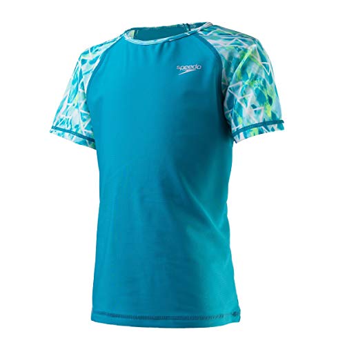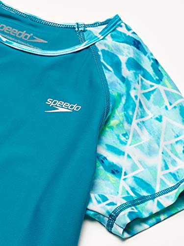 A playful print has found its way to the sleeves of this sporty swim top. Durable fabric offers superior chlorine resistance while blocking harmful UV rays. Raglan sleeves offer enhanced mobility; contrast stitching adds a fun color pop.